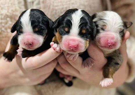 Expected adult weight 50-70Ibs, averaging 60Ibs. Soft textured, straight to loose wavy coat expected at maturity. These puppies are considered Medium Ultra Bernedoodles. Genetically, approximately 32% poodle and 68% Bernese Mountain Dog. Especially in larger breeds, females generally mature smaller than males.