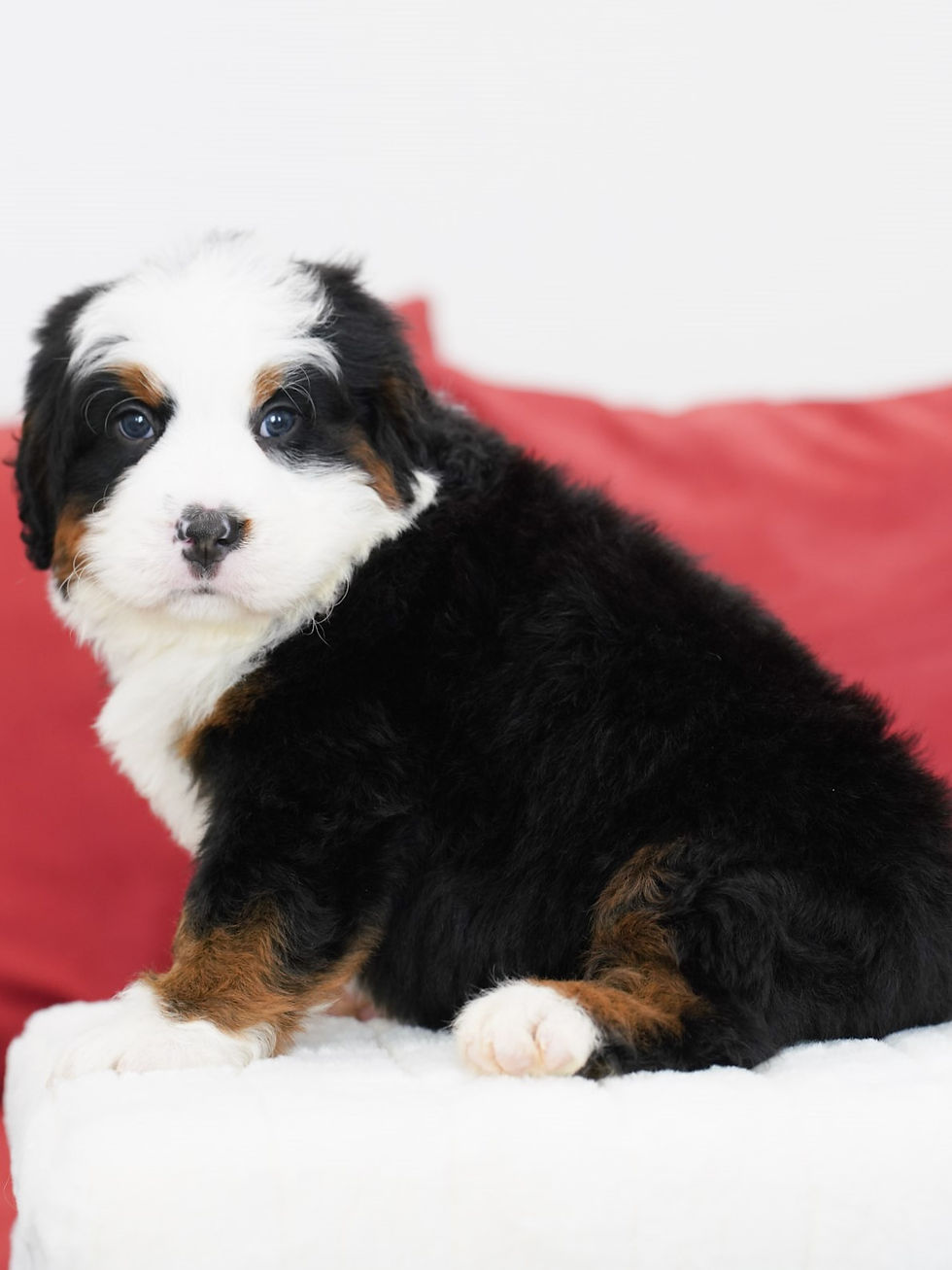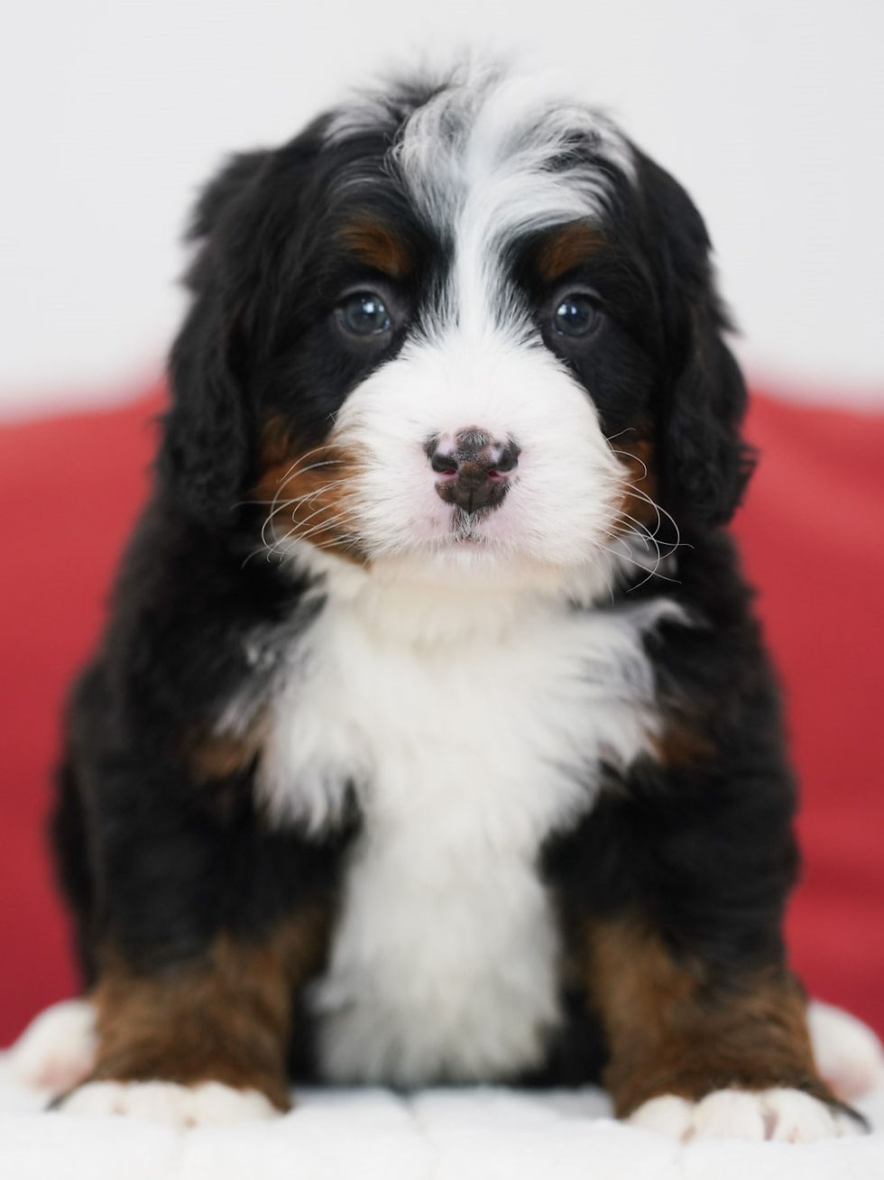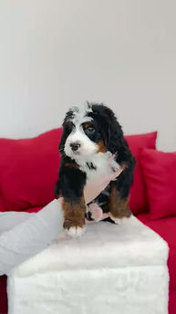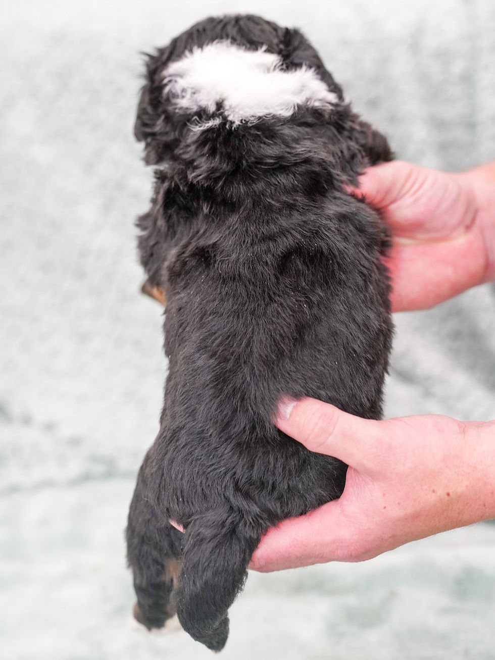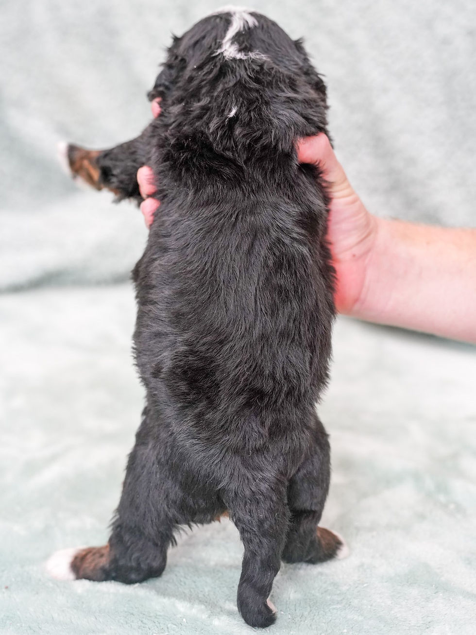 Expected adult weight 50-70Ibs, averaging 60Ibs. Soft textured, straight to loose wavy coat expected at maturity. These puppies are considered Medium Ultra Bernedoodles. Genetically, approximately 32% poodle and 68% Bernese Mountain Dog. Especially in larger breeds, females generally mature smaller than males.