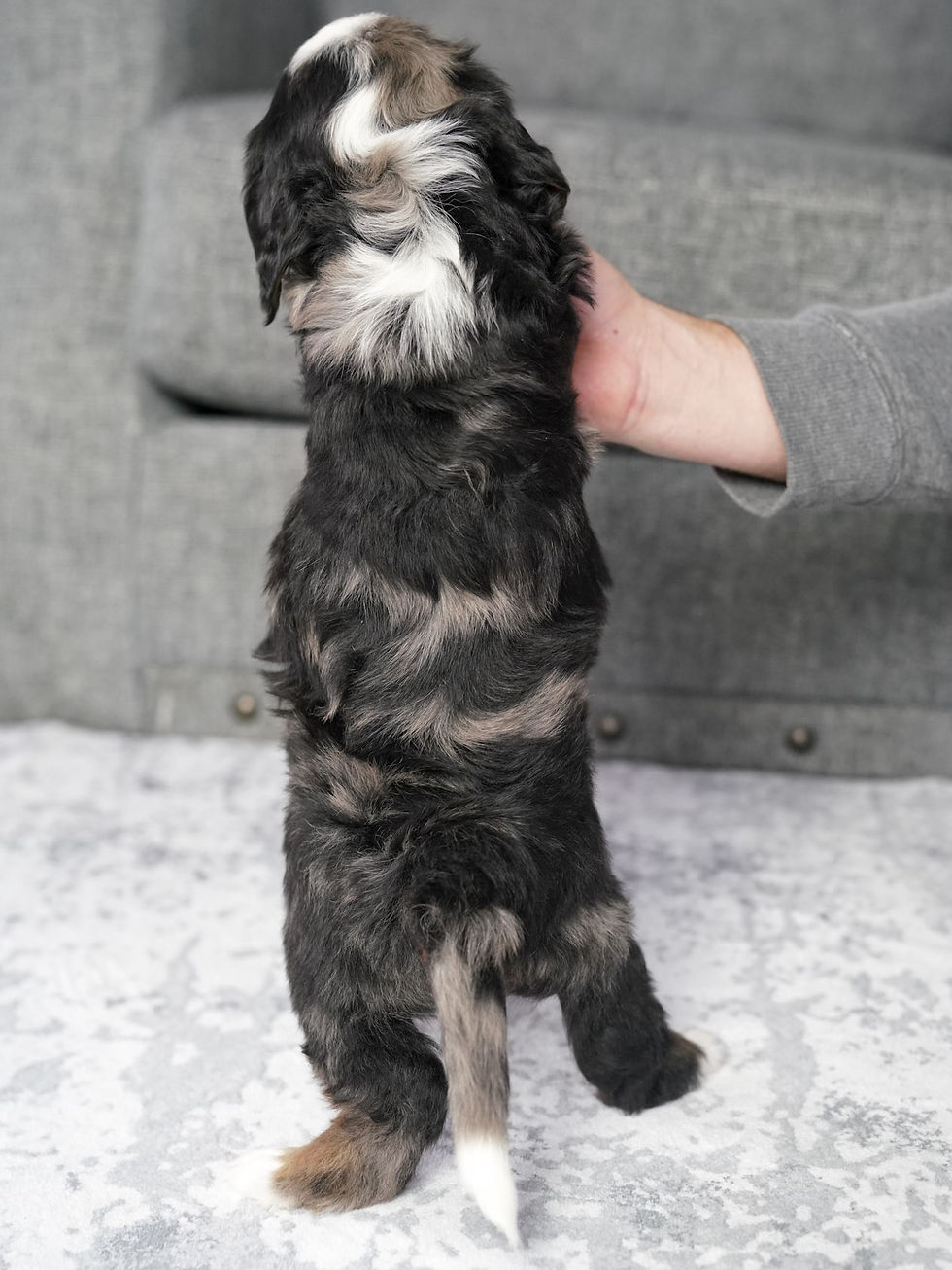 Meet Fanta, a shining star of our breeding program and a beloved F1 Mini Bernedoodle mom. With her impeccable genetics and vibrant coat, Fanta is a true gem and a significant stepping stone for the future of our program.