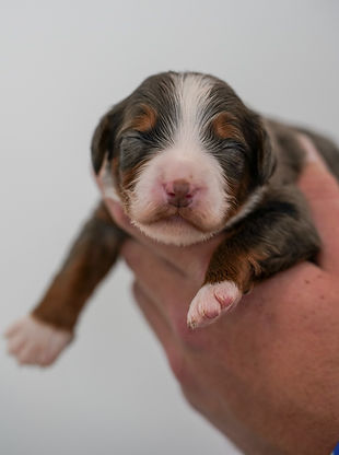 Expected adult weight 50-70Ibs, averaging 60Ibs. Soft textured, straight to loose wavy coat expected at maturity. These puppies are considered Medium Ultra Bernedoodles. Genetically, approximately 32% poodle and 68% Bernese Mountain Dog. Especially in larger breeds, females generally mature smaller than males.