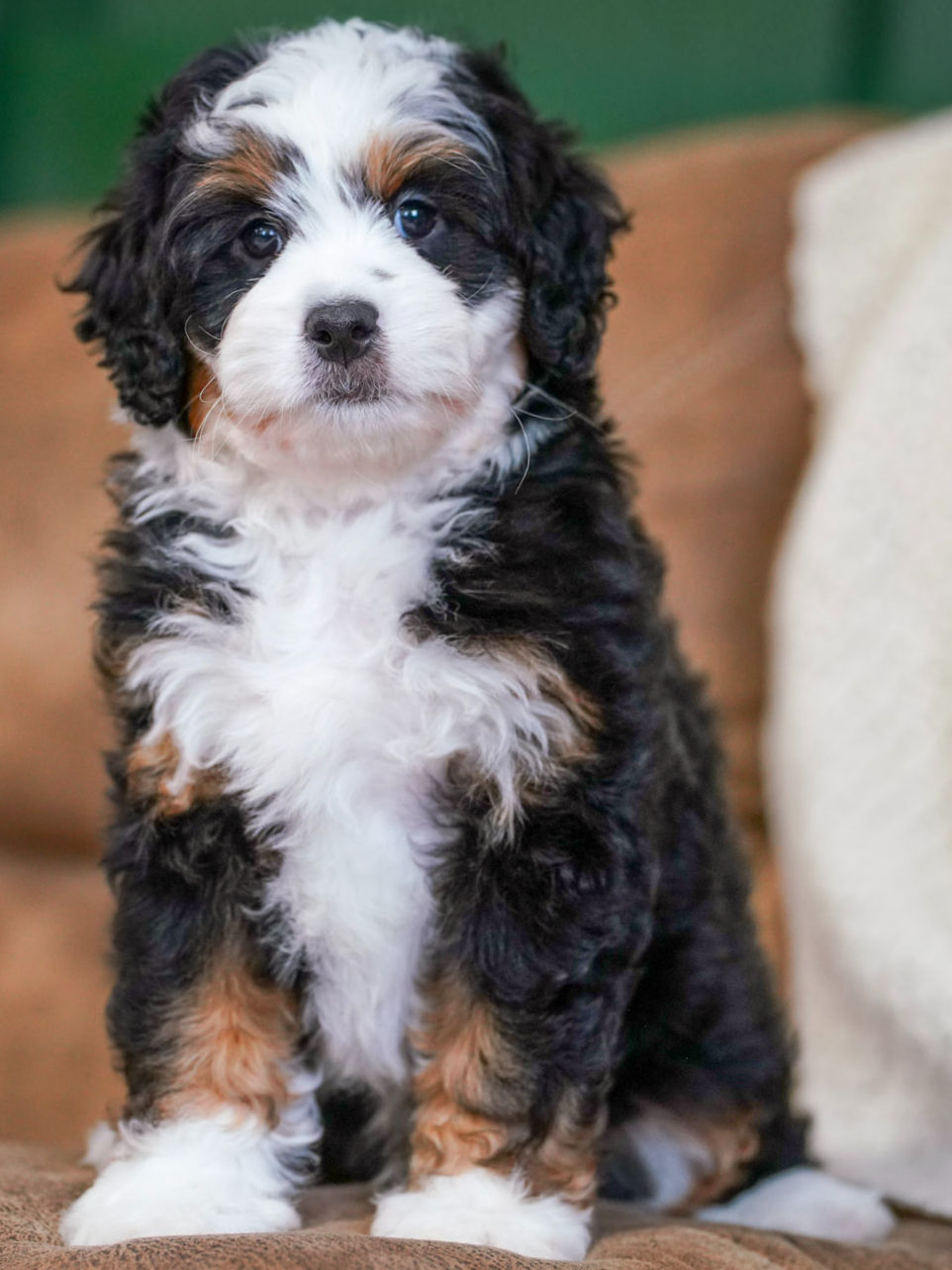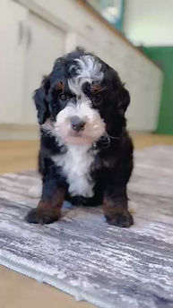 Expected adult weight 25-32Ibs, averaging 30Ibs. Soft textured wavy coat type expected at maturity. These puppies are considered small mini F1b Bernedoodles.