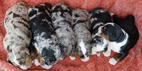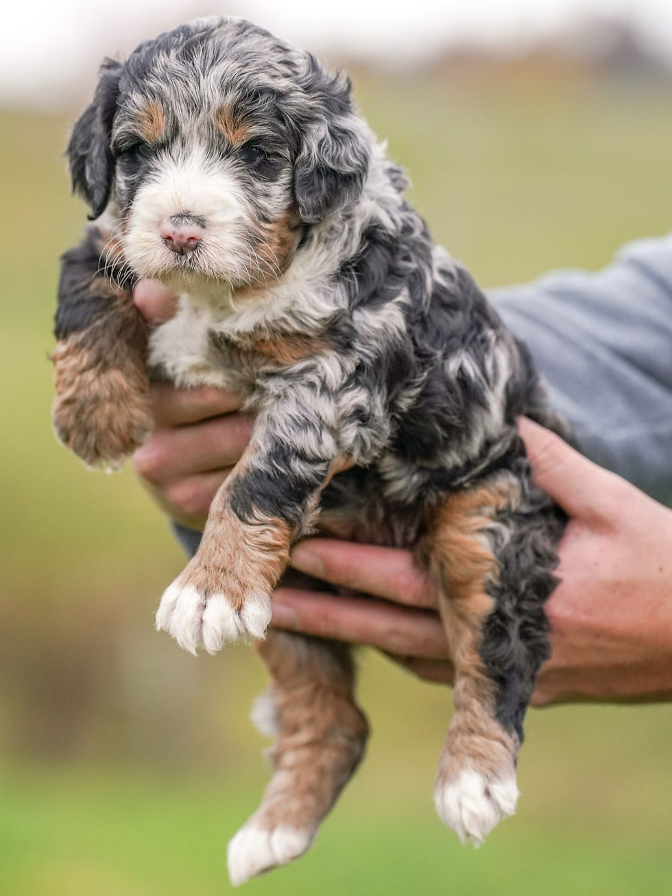 These pups are considered mini Multigenerational Bernedoodles, close to 60% poodle and 40% Bernese. Average weight expectancy mini (30-40Ibs). Soft, straight to wavy textured coats expected at maturity.