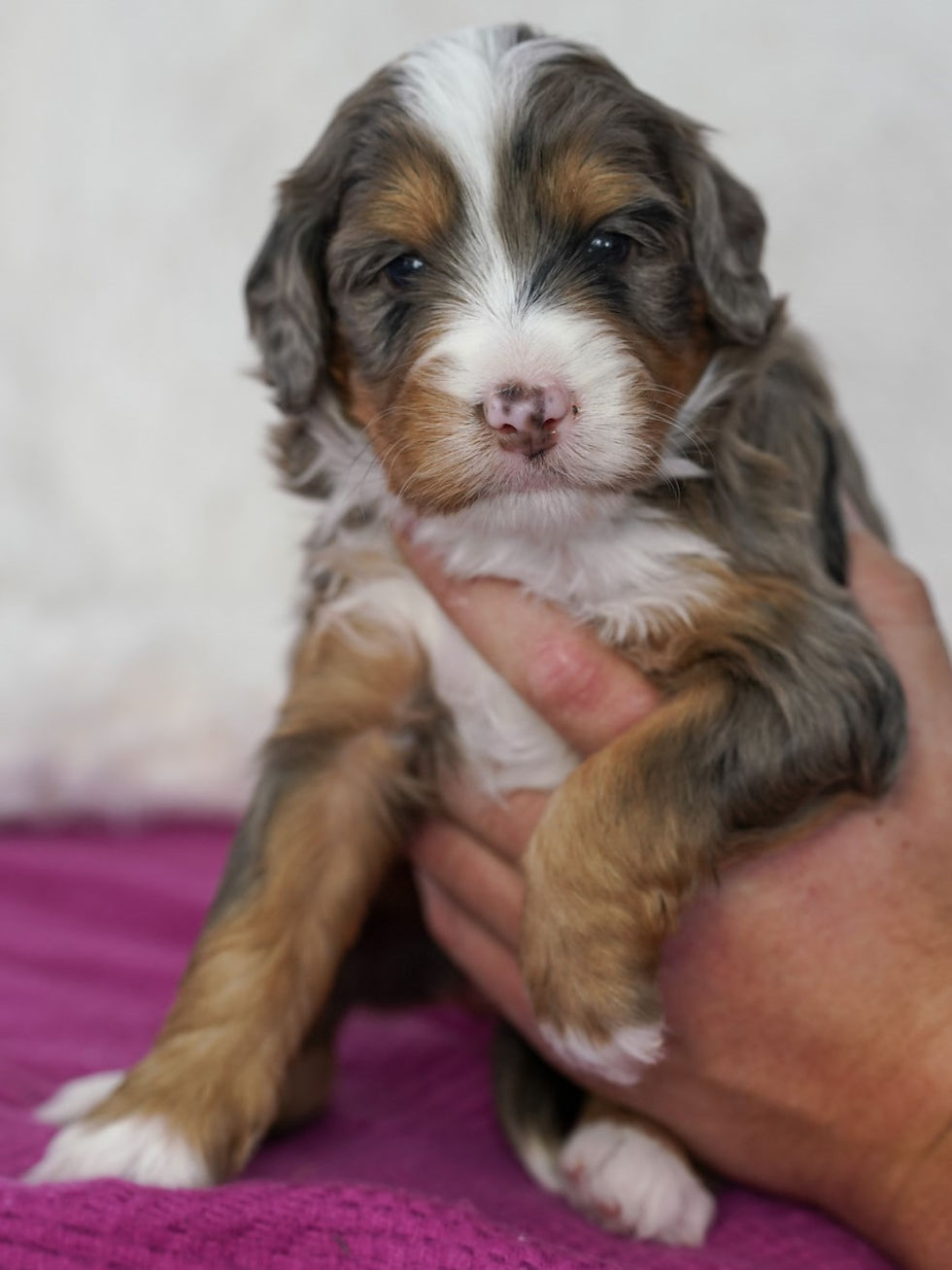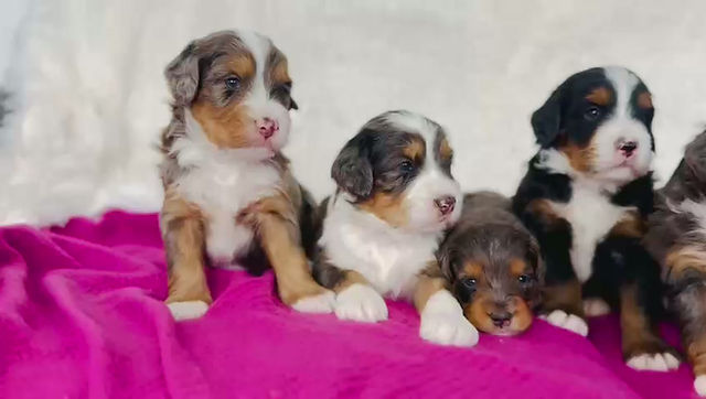 Expected adult weight 30-40Ibs, averaging 35Ibs. Soft textured, wavy coat expected at maturity. These puppies are considered Mini Multigerational Bernedoodles. Genetically, approximately 53% poodle and 47% Bernese Mountain Dog.